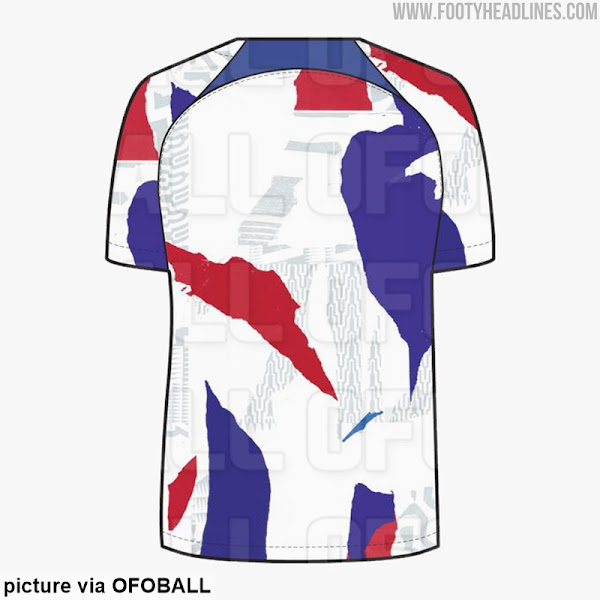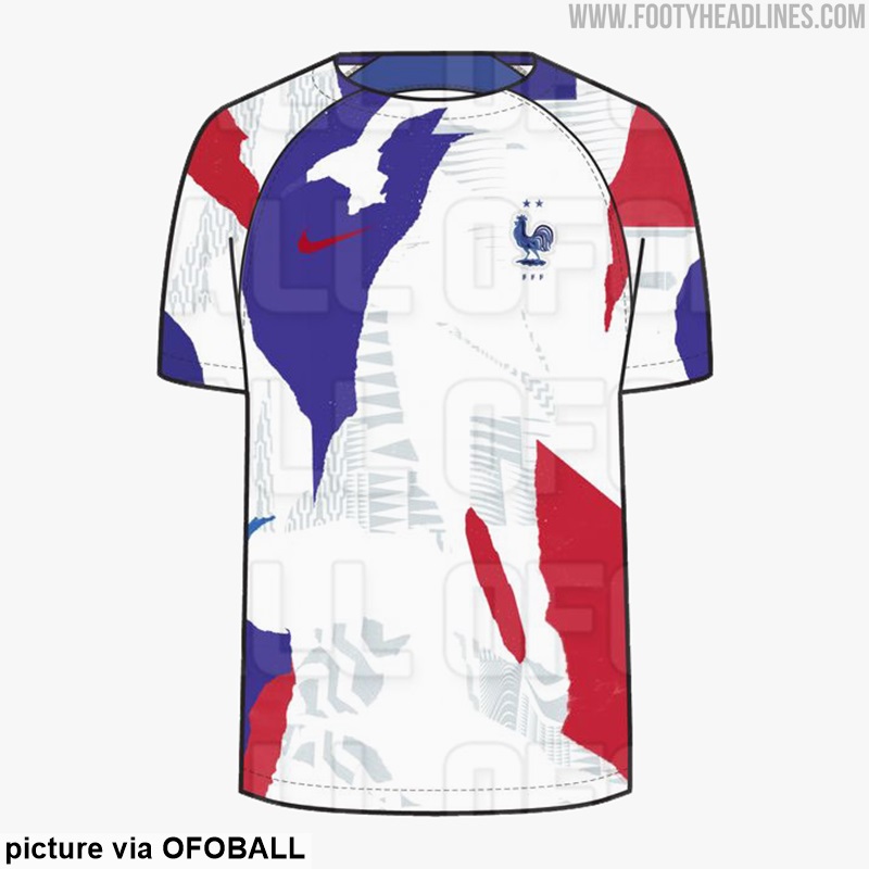 Das Nike Frankreich 2022 World Cup Pre-Match Fußballtrikot wurde geleakt. Es wird von Nike hergestellt und wird zum Aufwärmen vor den Spielen der WM 2022 getragen. Bilder mit freundlicher Genehmigung von OFOBALL.