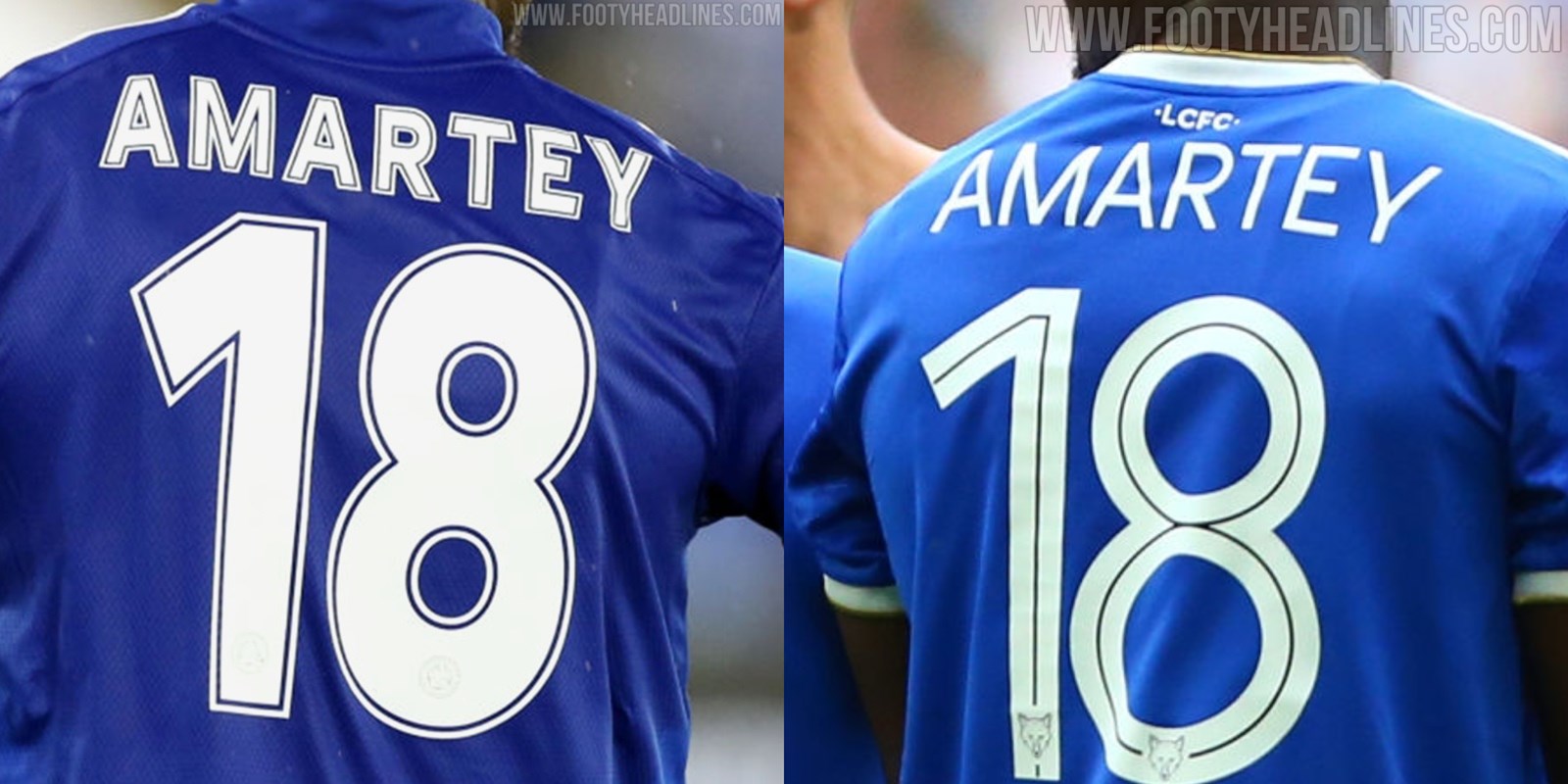 Die Leicester 21-22 Trikotschrift hat einen klassischeren Look als die vorherige Schriftart. Die großen Zahlen sind zugunsten eines schlankeren Stils mit einer kleinen Linie in der Mitte verschwunden.