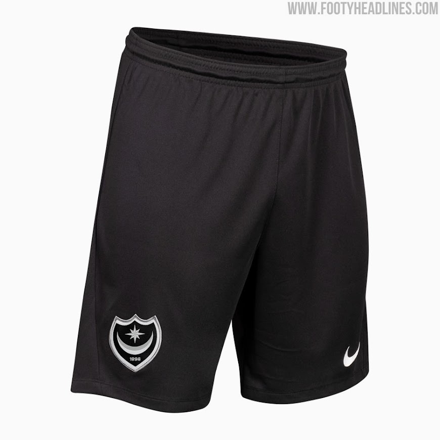 Schwarze Hosen und weiße Stutzen vervollständigen das neue Nike Portsmouth 2021-2022 Auswärtstrikot.