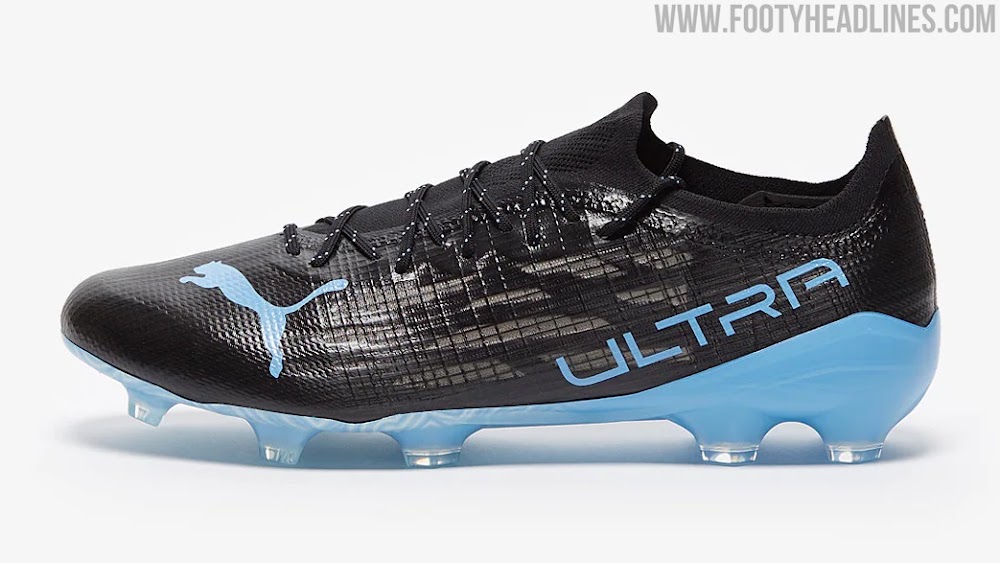 Mit einem sehr ähnlichen Ansatz wie der Future, sind die Puma Ultra Man City Fußballschuhe in "Black / Sky Blue" ebenfalls schwarz mit einer himmlischen Sohlenplatte, komplett mit dem "CITY" Muster.