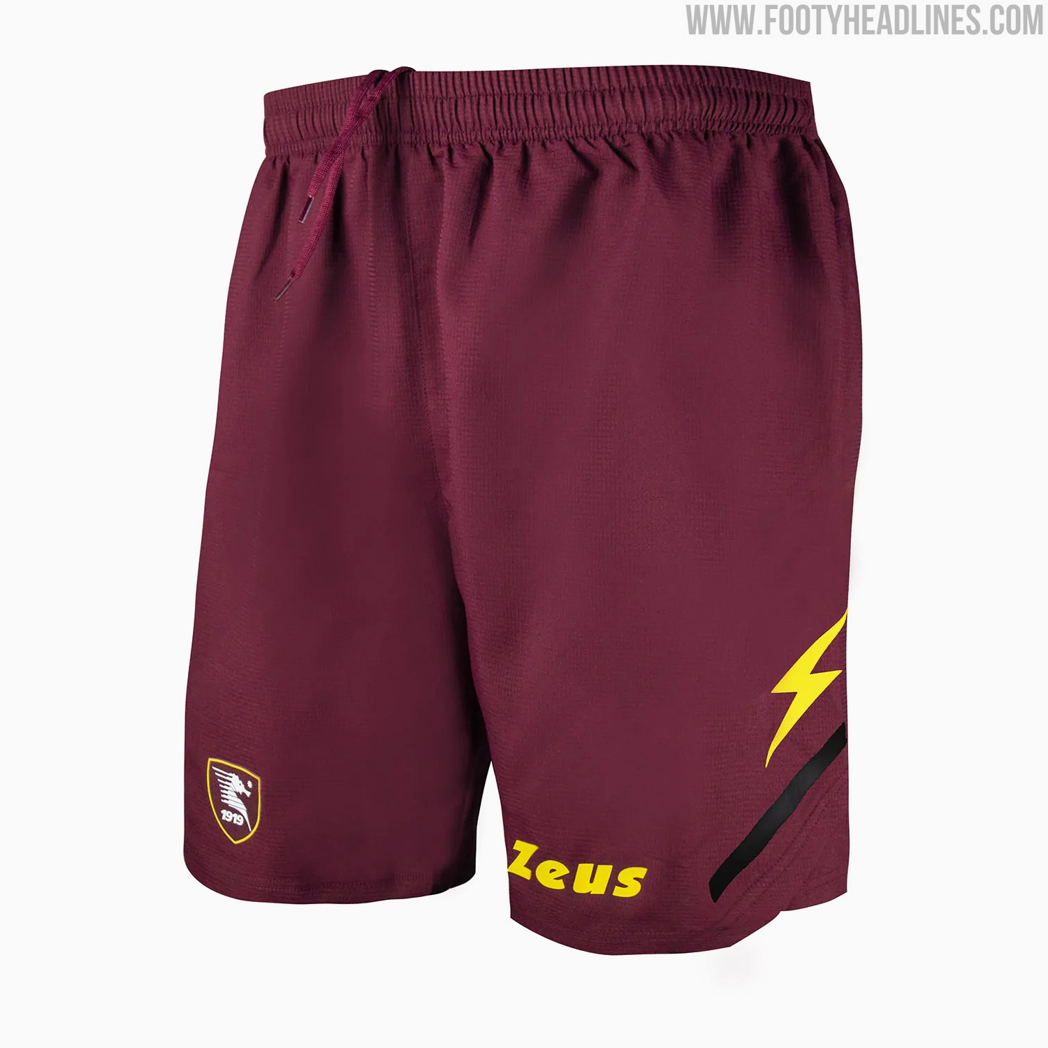Zeus kombiniert das Salernitana 2021-2022 dritte Fußballtrikot mit roten Hosen und schwarzen Stutzen.