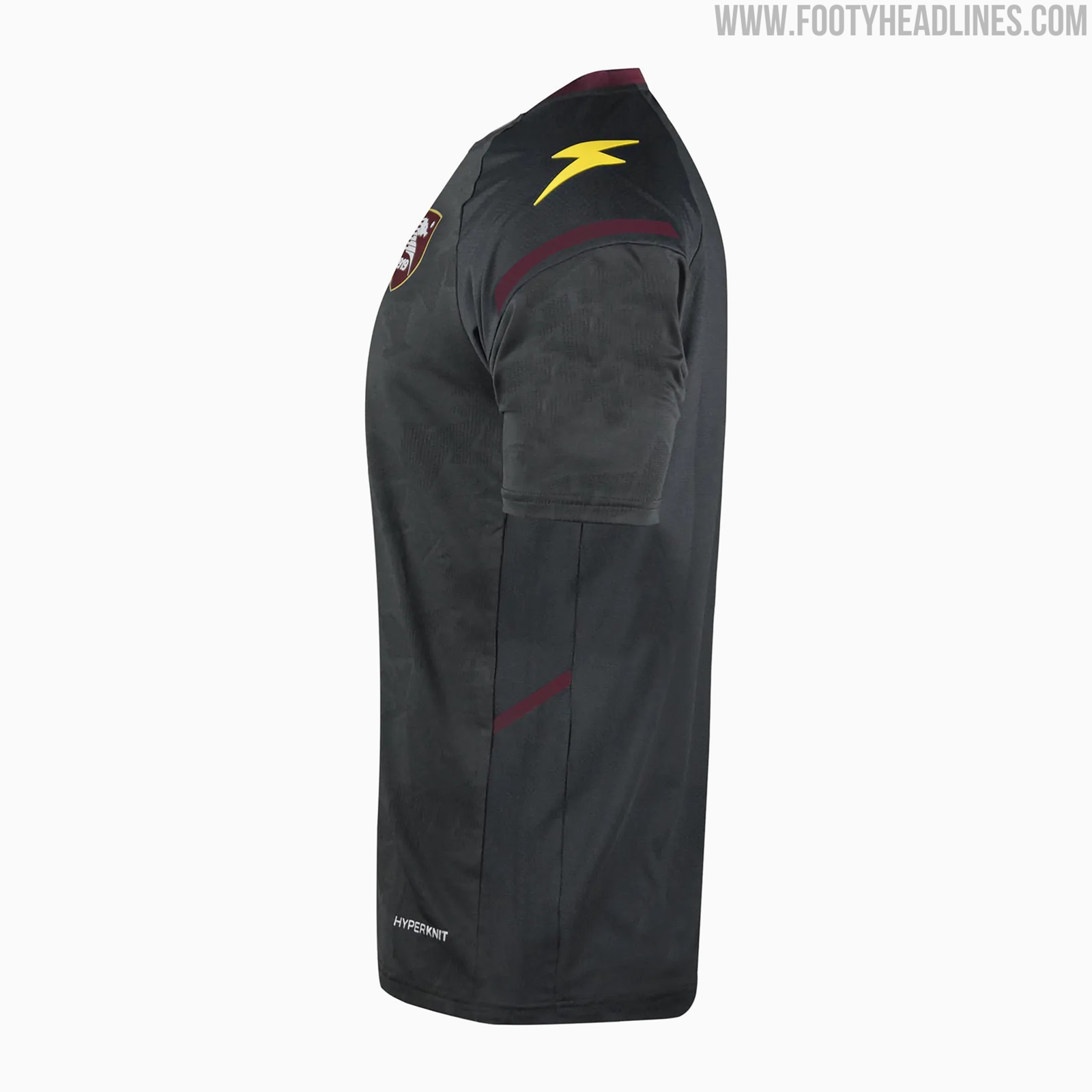 Hauptsächlich schwarz, zeigt das Zeus Salernitana 2021-2022 drittes Trikot einen subtilen Grafikdruck auf der Vorderseite. Das Zeus Logo auf der rechten Brust ist gelb, ebenso wie die Blitze auf jedem Ärmel. Dunkelrote Zierleisten runden das Erscheinungsbild ab.