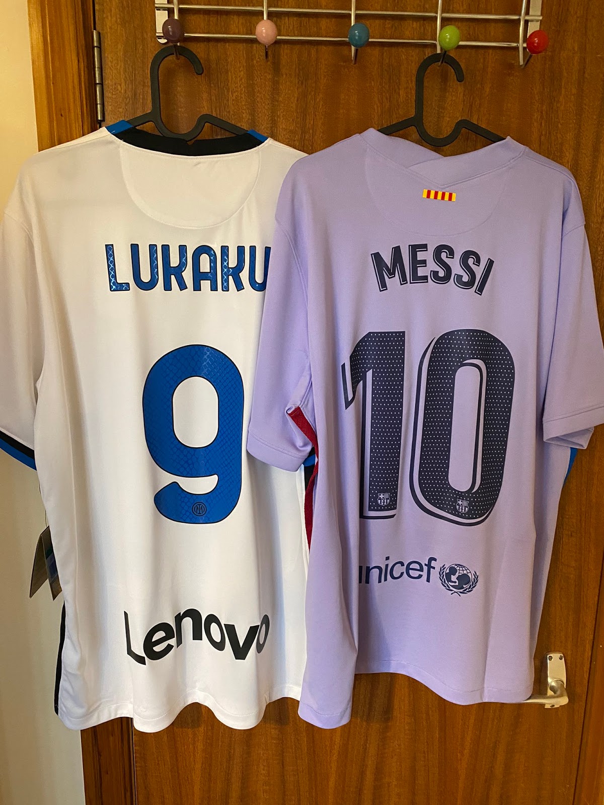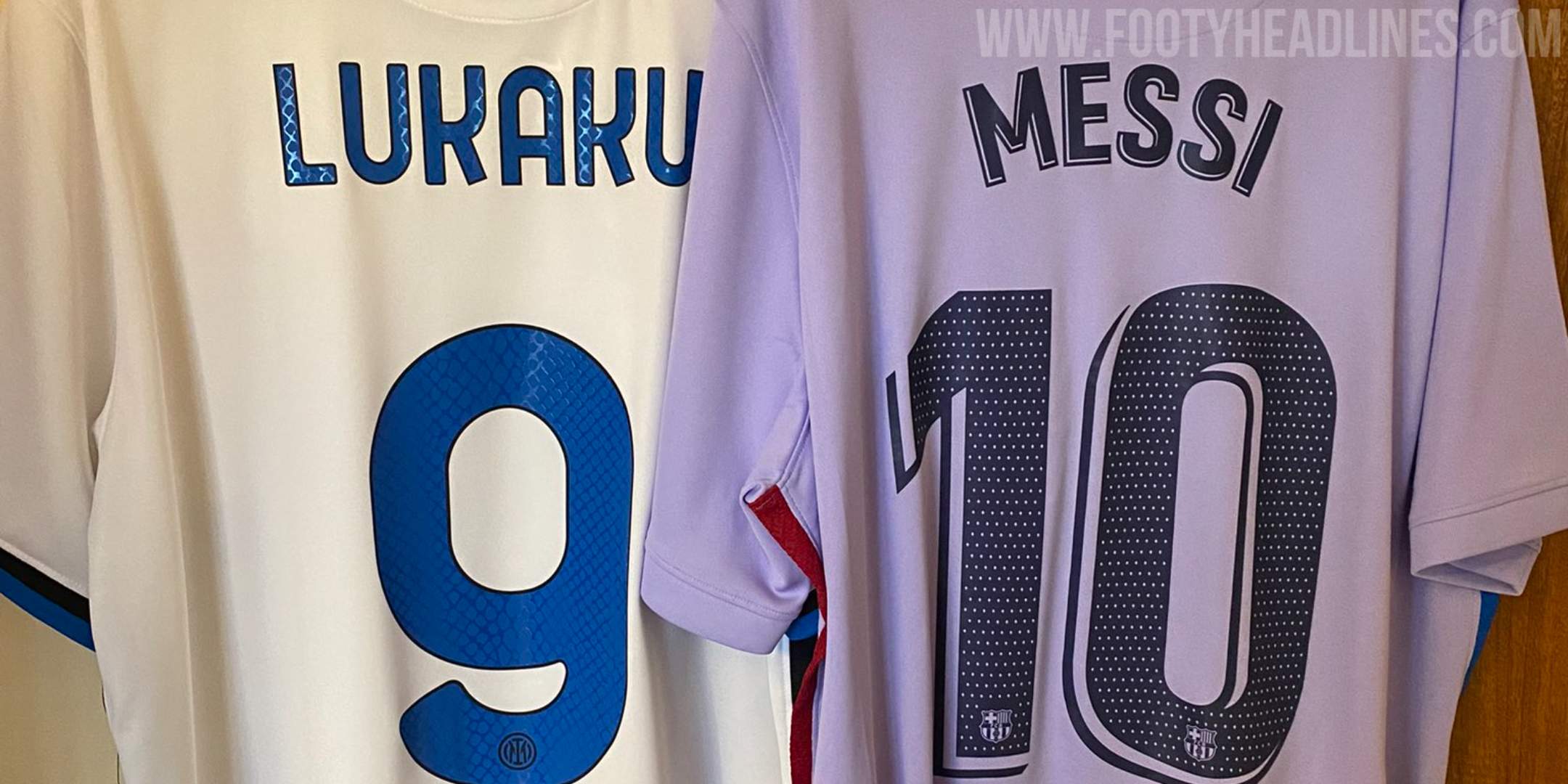 N88_Shirts hat das Nike FC Barcelona 21-22 Auswärtstrikot mit "Messi 10" und das Inter Mailand 21-22 Auswärtstrikot mit "Lukaku 9" auf dem Rücken.