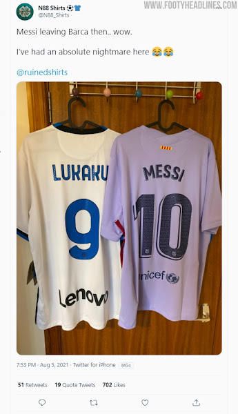 N88_Shirts hat das Nike FC Barcelona 21-22 Auswärtstrikot mit "Messi 10" und das Inter Mailand 21-22 Auswärtstrikot mit "Lukaku 9" auf dem Rücken.