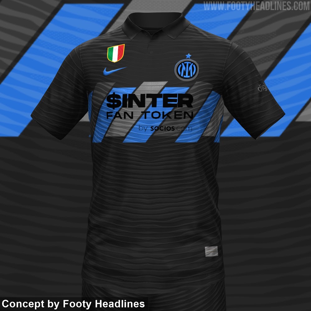 Die vier verschiedenen Konzepte nehmen das offizielle Nike Inter 21-22 Trikot als Basis und ersetzen den Multicolor-Look durch weniger kräftige Akzentfarben.