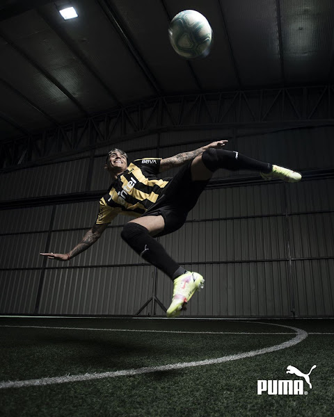 Das neue Trikot zum 130-jährigen Jubiläum von Peñarol 20 21 kombiniert die schwarz-gelben Streifen des Vereins mit einem ganz traditionellen, schwarzen Schnürkragen. Die Ärmel setzen die Streifen fort.