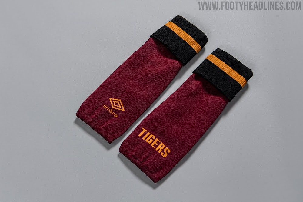 Umbro kombiniert das dritte Fußballtrikot von Hull City 2021-22 mit bernsteinfarbenen Hosen und weinroten Stutzen.