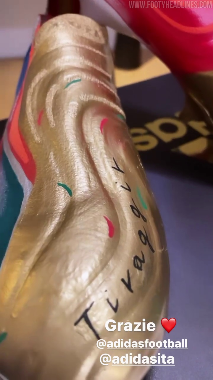 Die Schuhe wurden Lorenzo Insigne in einer speziellen schwarzen Box mit dem goldenen Schriftzug "Wembley, 11/07/2021" und den Farben der italienischen Flagge als Pinselstrich geliefert. Sie sind nicht käuflich zu erwerben.