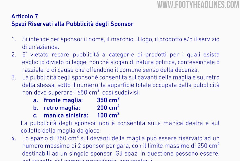 In UEFA-Wettbewerben darf die Gesamtfläche für Sponsorenwerbung auf der Vorderseite des Trikots 200 cm² nicht überschreiten. In der Serie A darf die Gesamtfläche für Sponsorenwerbung für einen einzelnen Sponsor 250 cm² nicht überschreiten.