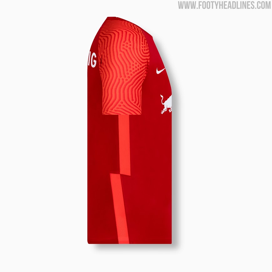 Basierend auf der Nike Strike II 21-22 Template, kombiniert das Nike RB Leipzig 21-22 vierte Trikot eine rote Basis mit leuchtend roten Elementen und weißen Logos.