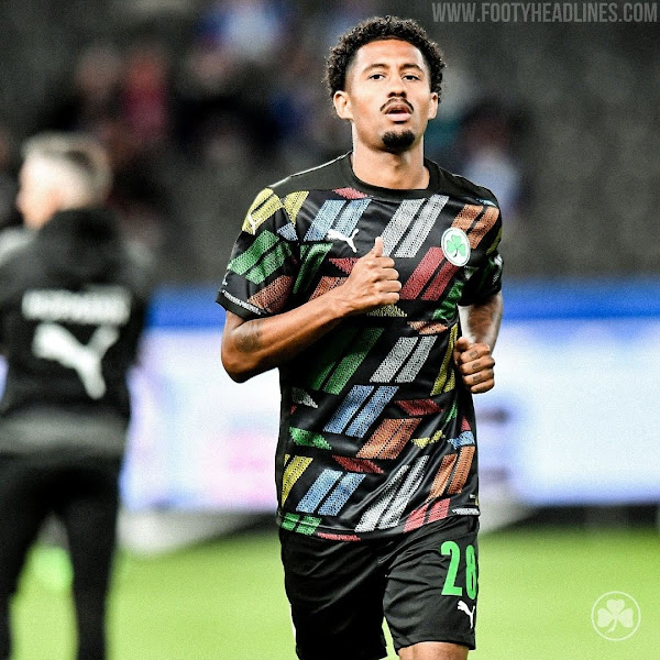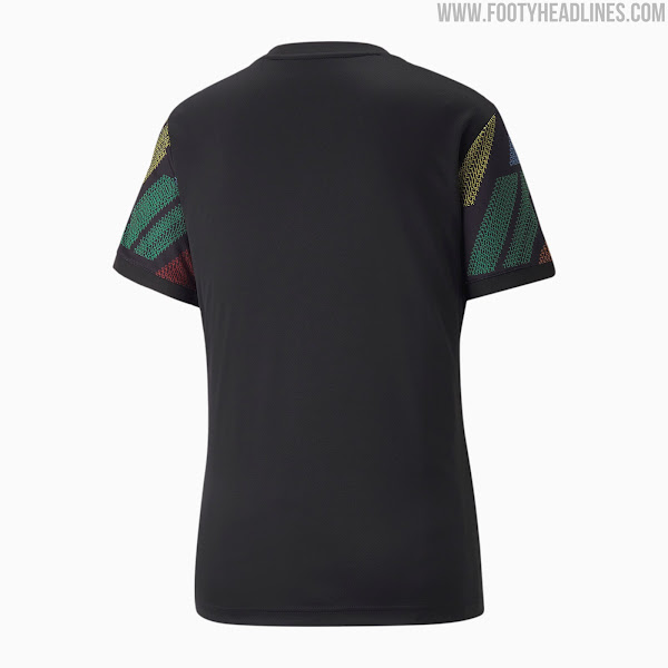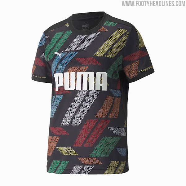 Die Pre-Match-Trikots basieren auf einem Standard-Puma-Teil, das in Kürze auch als "Blanko" erhältlich sein wird. Sie sind schwarz und haben ein buntes Muster, das aus dem "Stronger Together"-Text besteht.