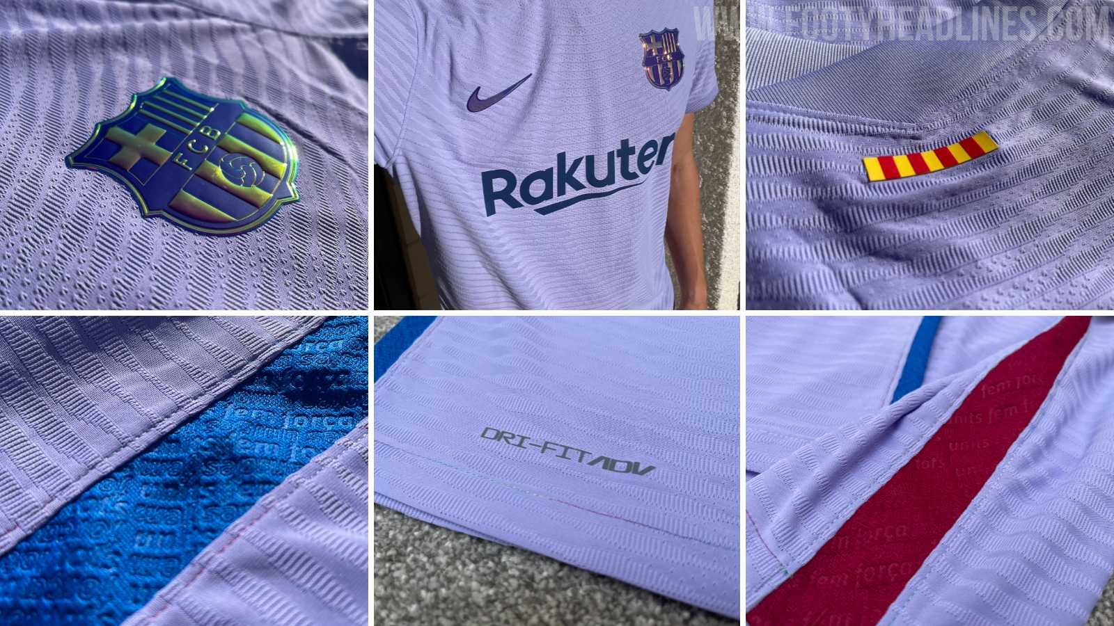 Gemäß Artikel 8.04 des offiziellen UEFA-Ausrüstungsreglements ist Material, das "reflektierend ist oder seine Farbe unter äußerem Einfluss (Druck, Licht, Wasser usw.) ändert", verboten. Das Barca 21-22 Auswärtstrikot kommt mit schillernden Nähten und Logos, die je nach Blickwinkel ihr Aussehen verändern.