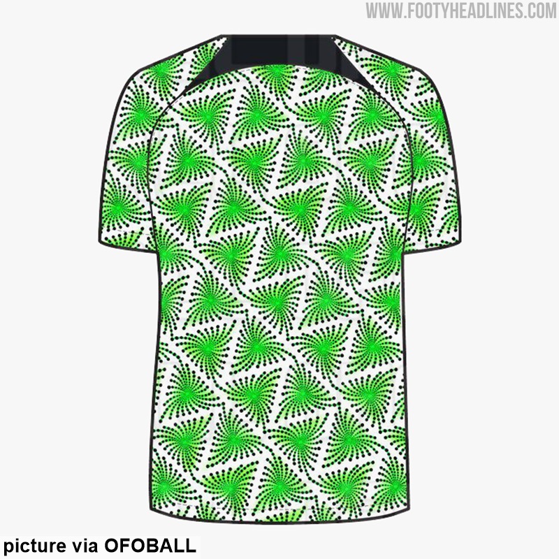 Das Nike Nigeria 2022 Auswärtstrikot ist weiß mit einem einzigartigen schwarzen Muster auf den Ärmeln. Das gleiche Muster ist auch auf der Nike Nigeria 2022 Einlaufjacke zu sehen. Grüne Applikationen werden für Teile des Kragens und der Ärmelbündchen des Nigeria 2022 Auswärtstrikots verwendet, während der Swoosh schwarz ist.