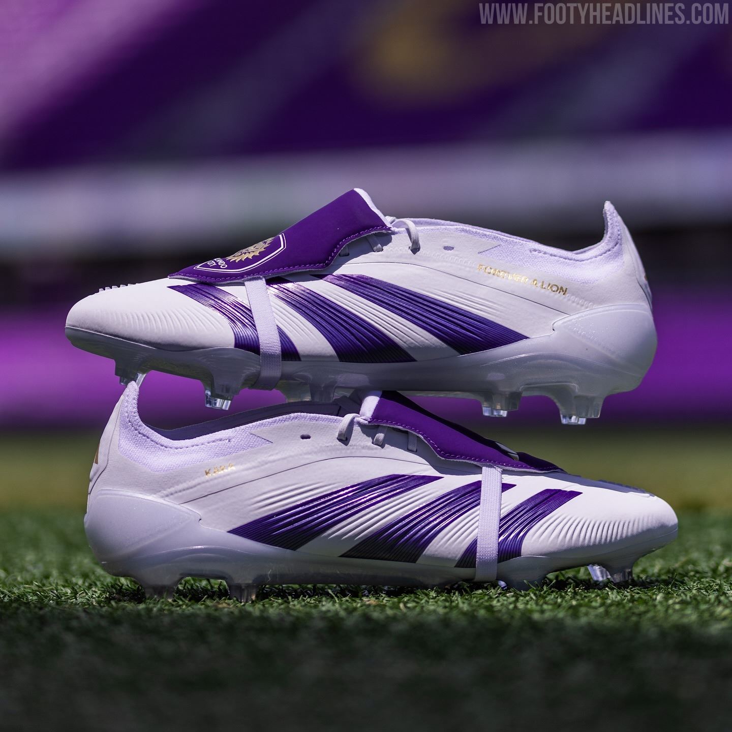 Sieh dir unten die neuen Adidas Predator 2024 'Forever A Lion' Fußballschuhe in Weiß/Lila/Gold an.